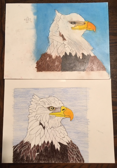 We used the Grid Method for drawing our picture. It was new to my son, but something I tried before in a drawing/design class. This involves drawing a grid over the photo you want to replicate. Then drawing the same proportional grid over your art paper. This helps keep the proportions and focus on one section at a time.